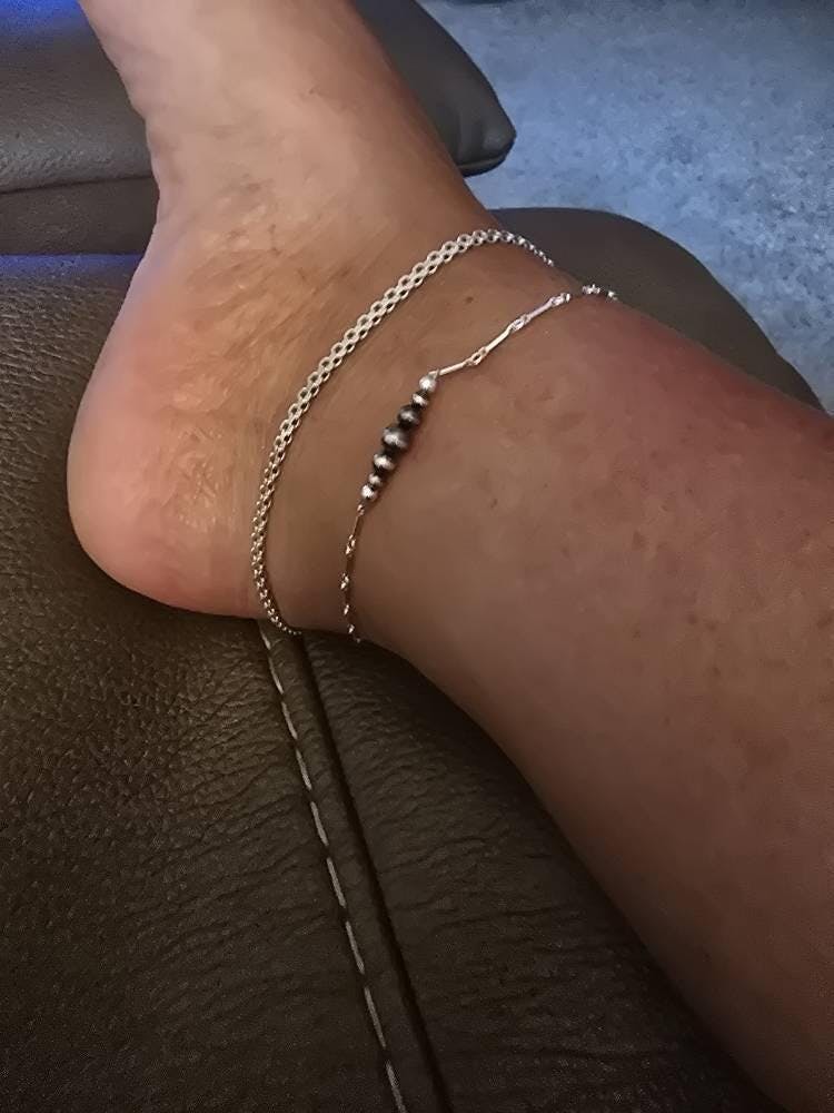 This dainty ankle bracelet features genuine 3–5mm Navajo pearls — also known as desert pearls — strung on a sterling silver 2.3mm bar and ring chain. Lightweight and full of subtle shine, it blends traditional craftsmanship with modern elegance.