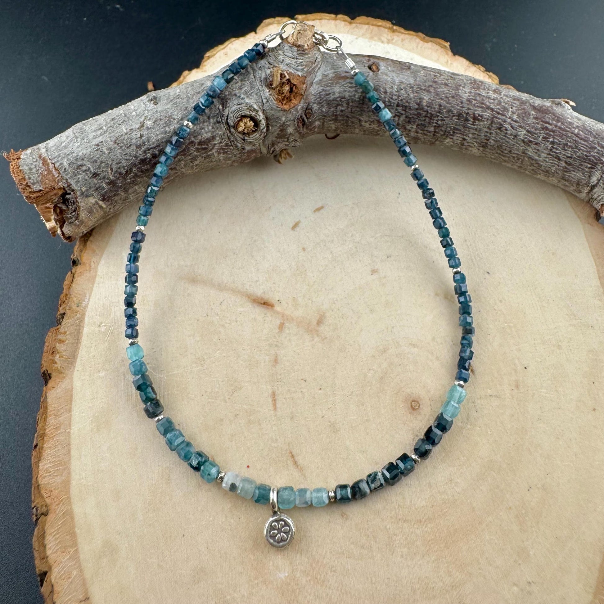 This ankle bracelet features genuine 3 & 4mm cube-cut Paraíba Blue Indicolite Tourmaline gemstones, spaced with sterling silver beads and finished with a tiny silver flower charm and lobster clasp. It’s dainty, lightweight, and full of laid-back sparkle — perfect for stacking or wearing solo.