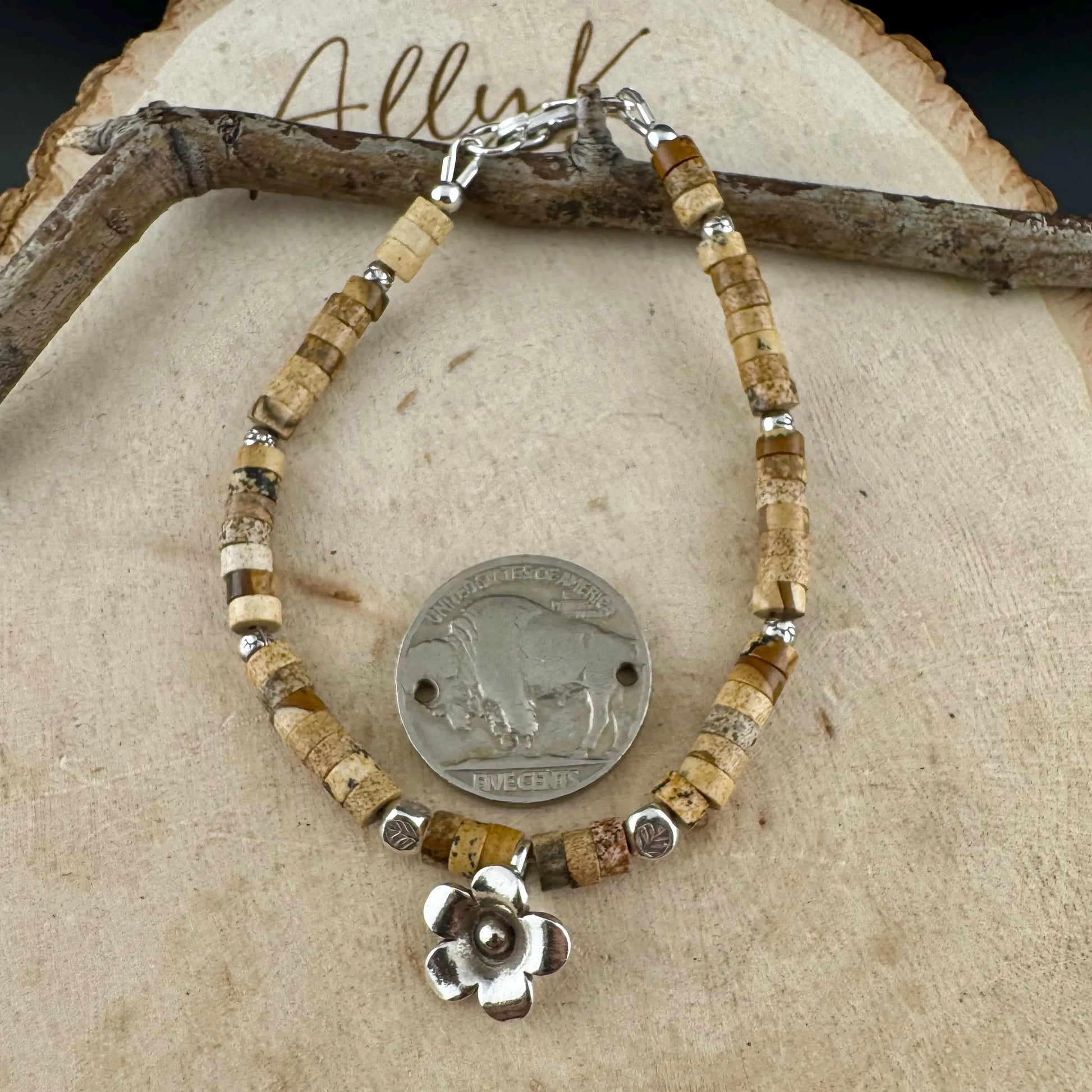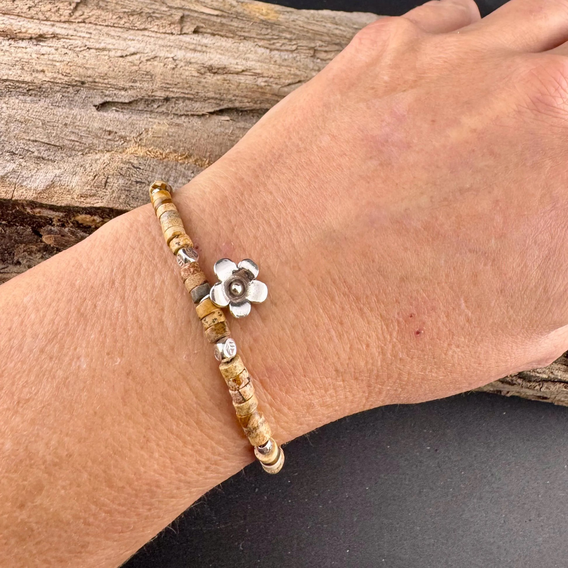 Picture Jasper Bracelet • 4mm Heishi Beads • Sterling Silver Flower Charm