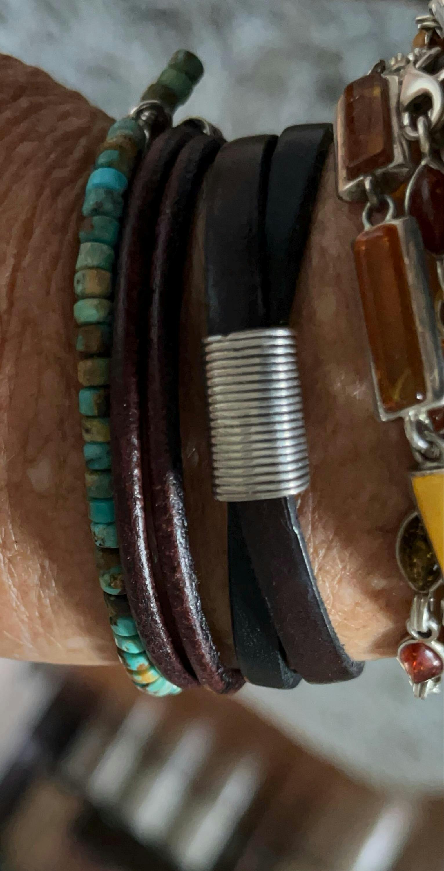Genuine conditioned leather cord bracelet with dark brown and black cross over, zamak silver accent with magnet closure. All silver pieces are subjected to an anti-allergic process (nickel and lead free) with silver plating of 8 microns of sterling silver. Comes in plain or embossed leather- black or dark brown.