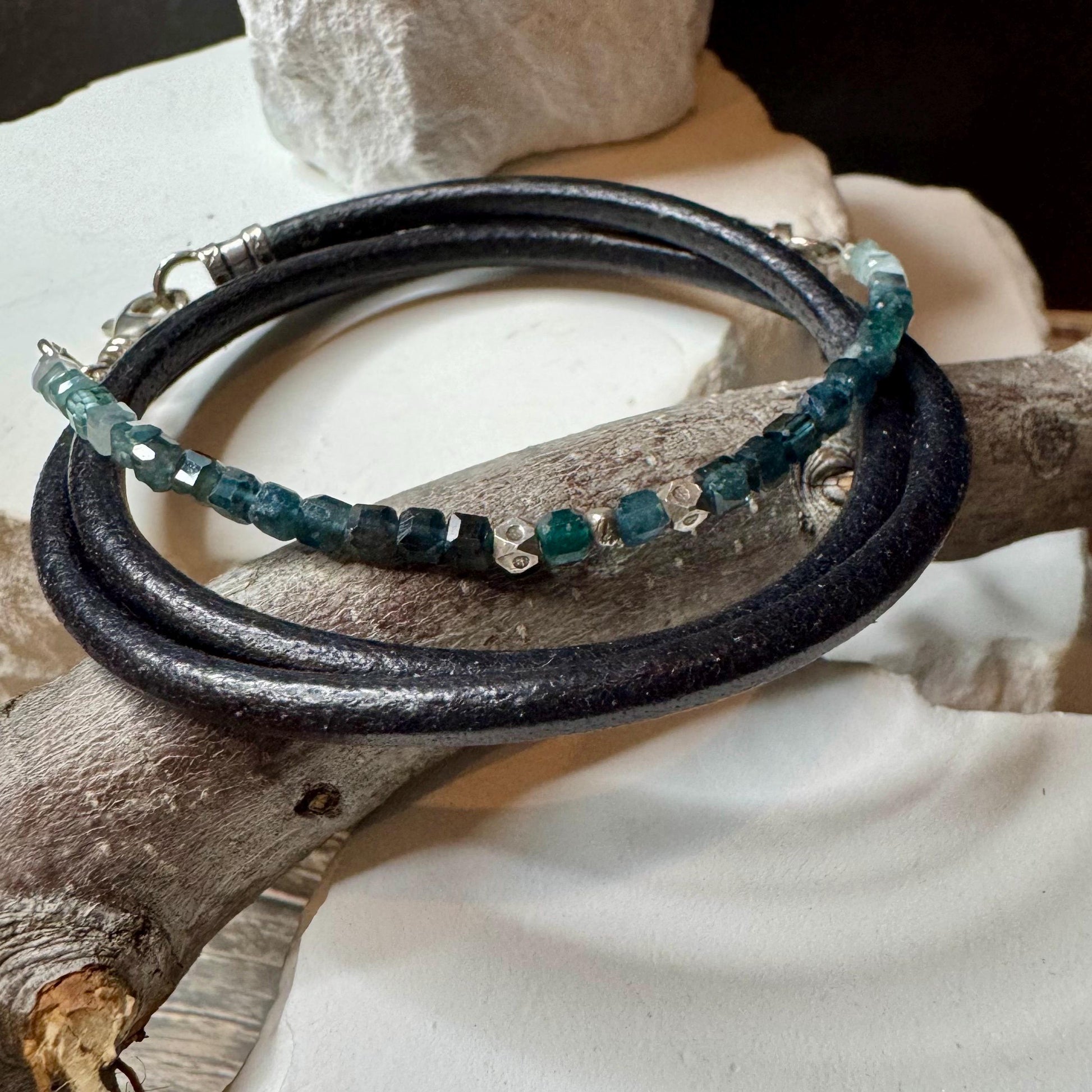 This bracelet is a stunner — and trust me, the photos don’t do it justice. Handcrafted with black 3mm round conditioned leather, it wraps twice around the wrist and features a half cuff of 3mm AAA-grade Paraíba Blue Tourmaline (Indicolite) gemstones. Ranging from deep navy to soft sky blue, these rare beauties shimmer with quiet power. Finished with sterling silver spacers and a large swivel lobster clasp, it’s easy to wear and impossible to ignore.