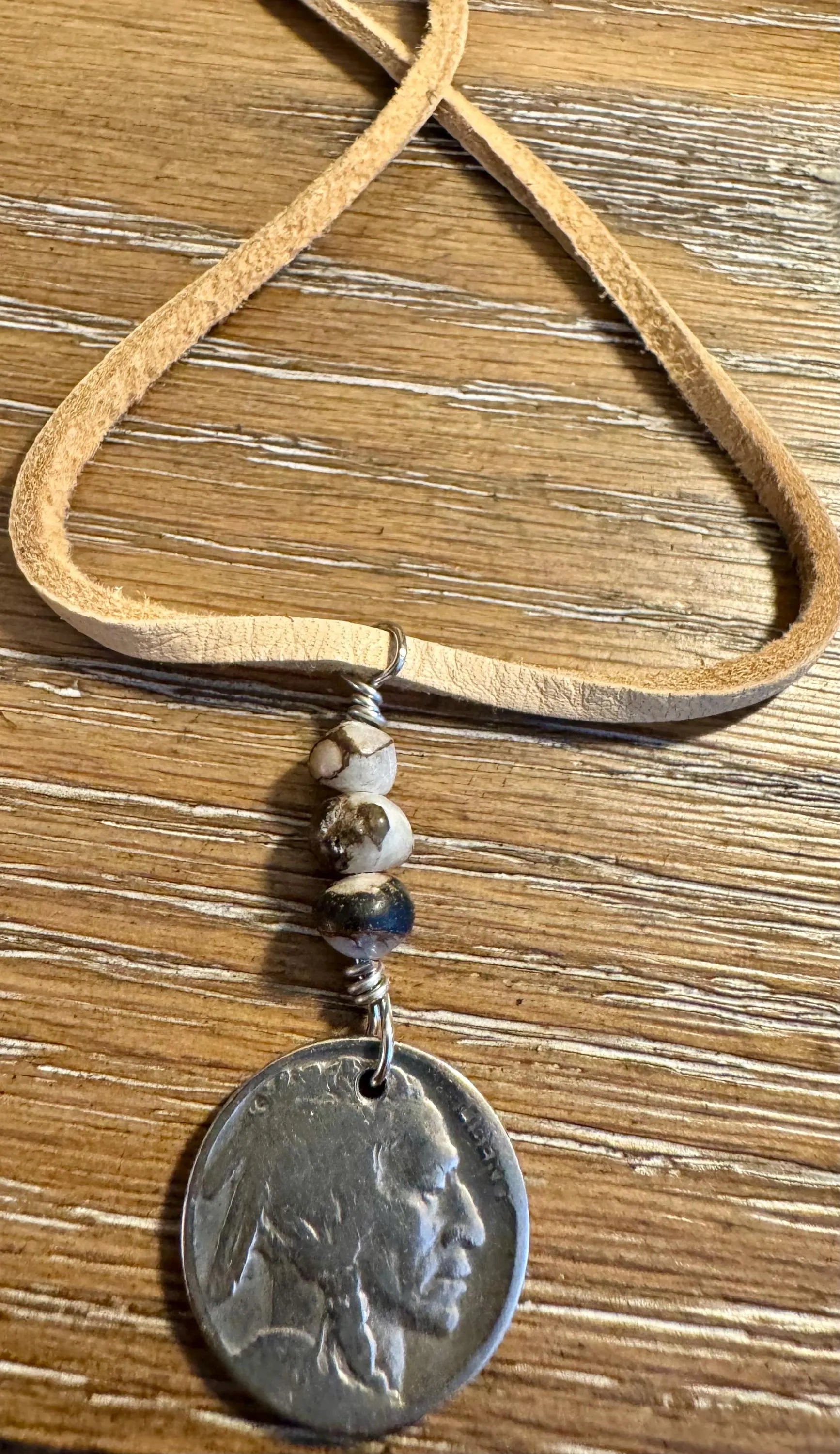 A soulful blend of history and harmony, this handcrafted necklace features an authentic Indian Head Buffalo Nickel paired with semi-round 6mm White Buffalo and bronze accent beads. Strung on genuine, ultra-soft deerskin lace and finished with sterling silver wiring and a lobster clasp, this piece offers adjustable wear from 16 to 22 inches — perfect for layering or wearing as a choker.