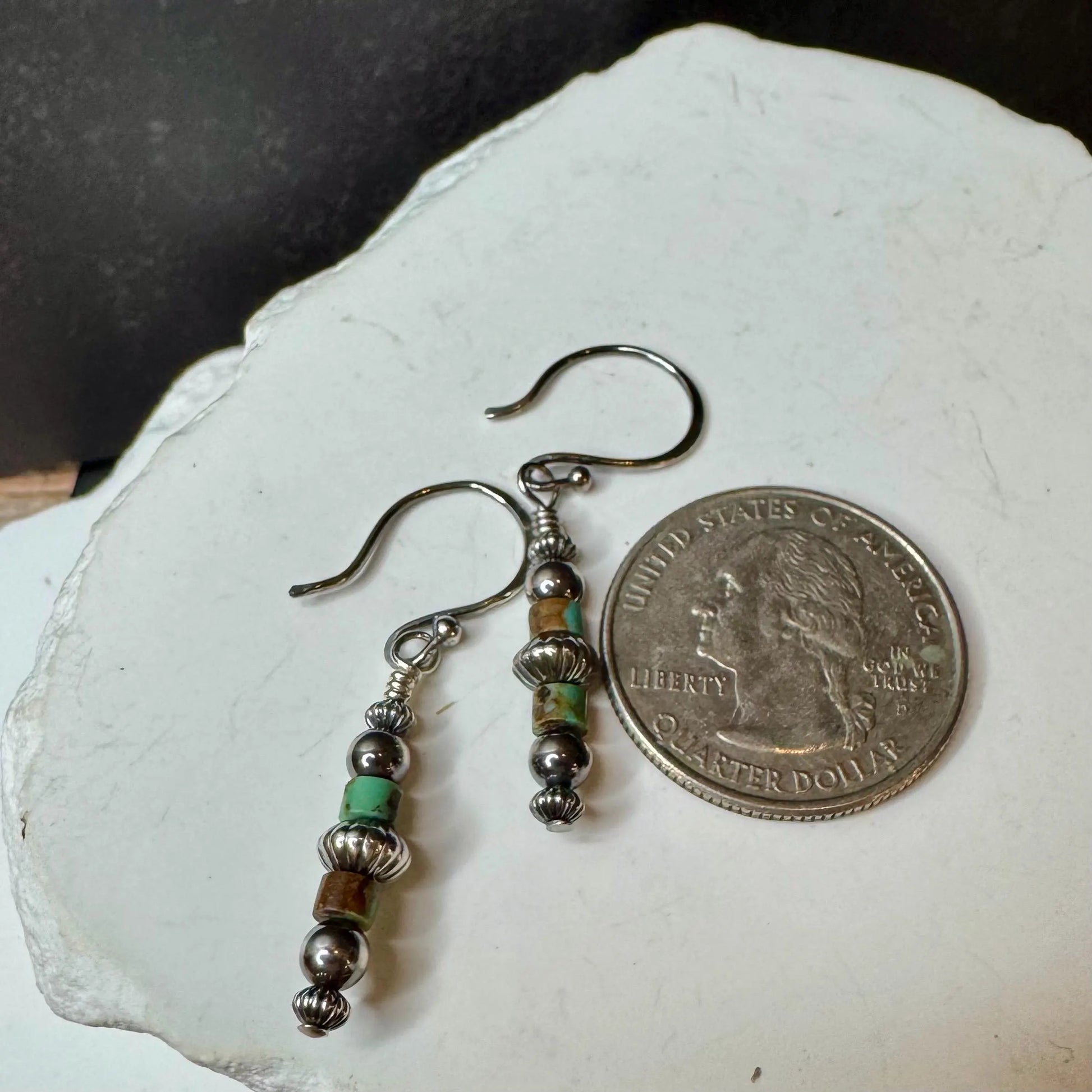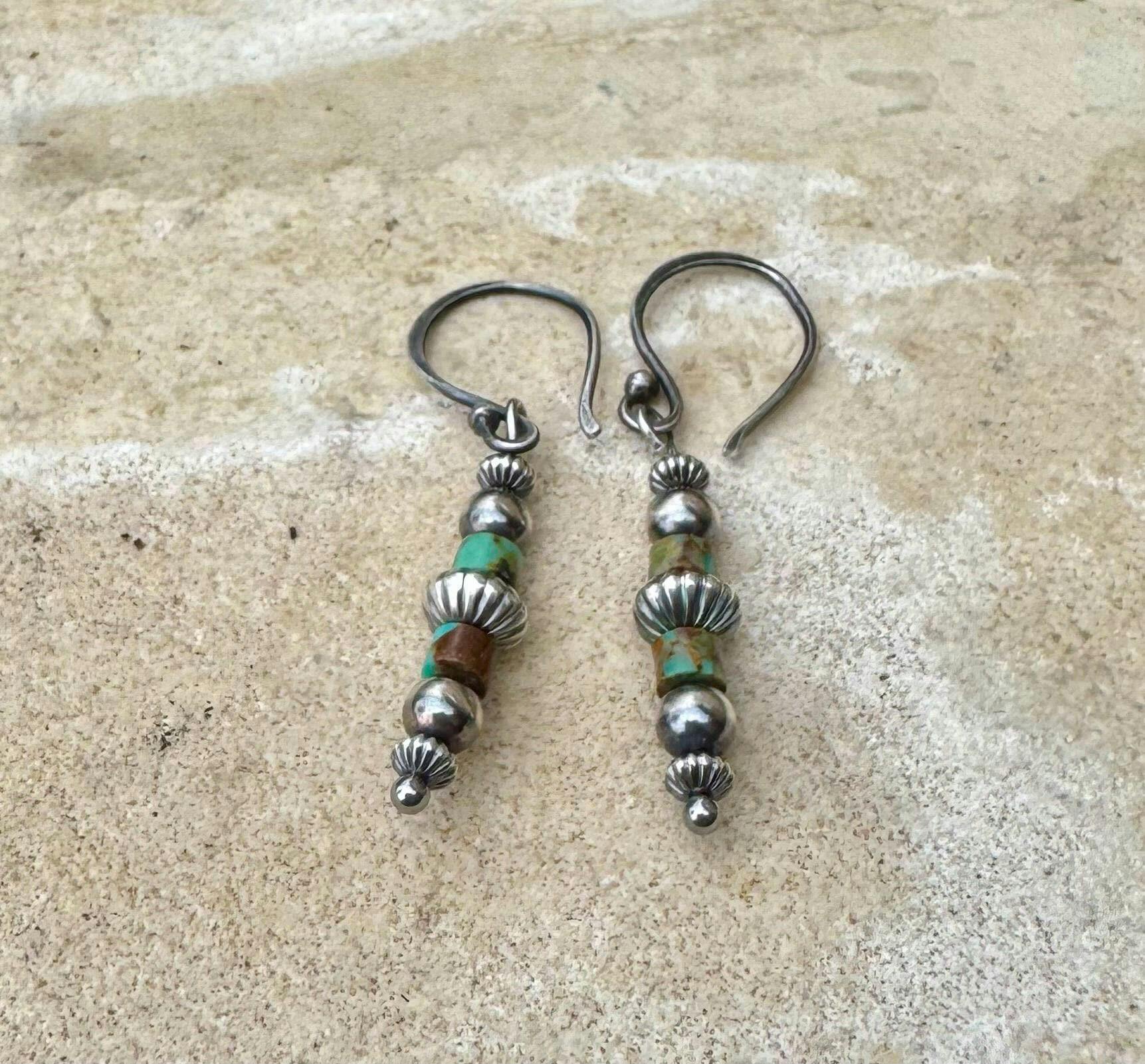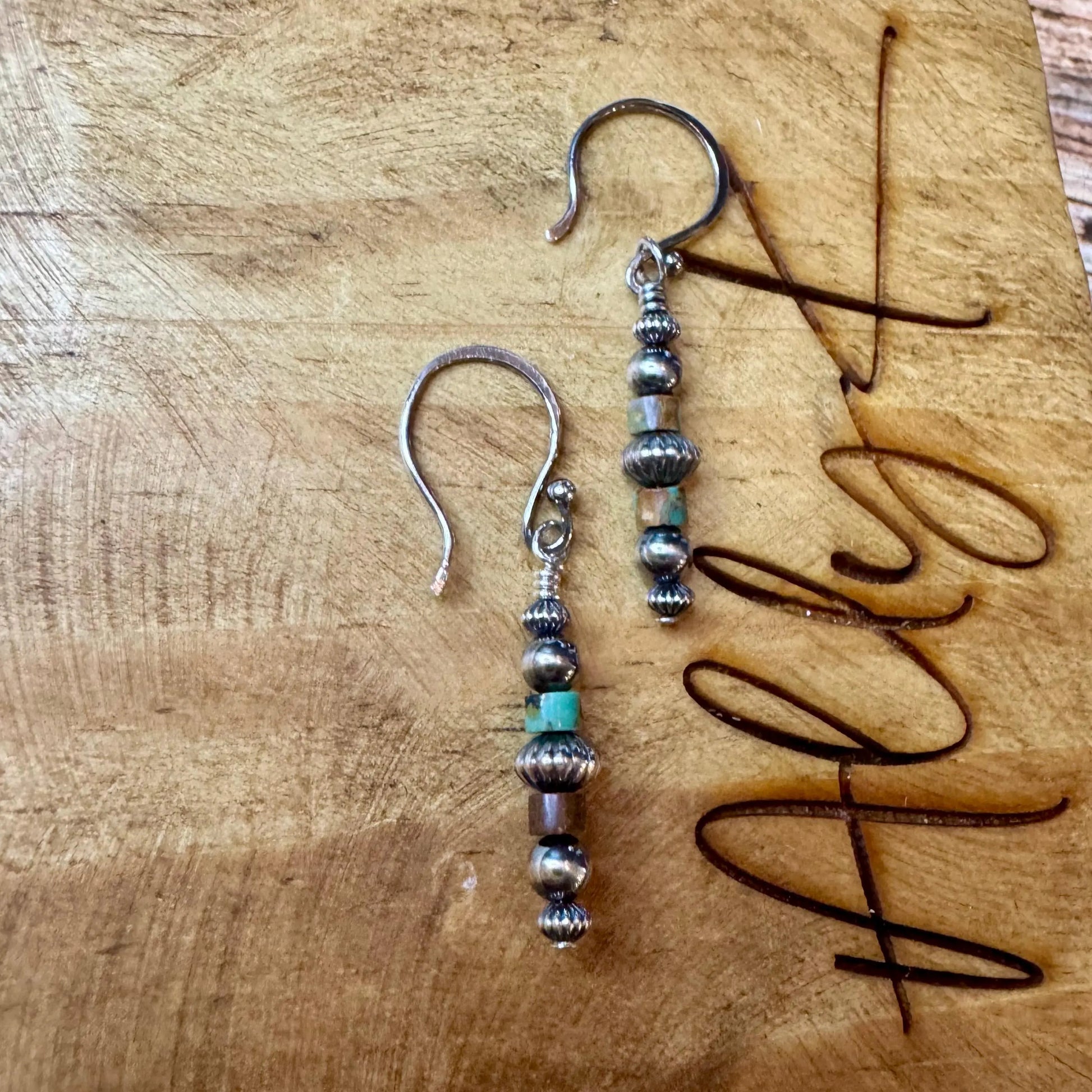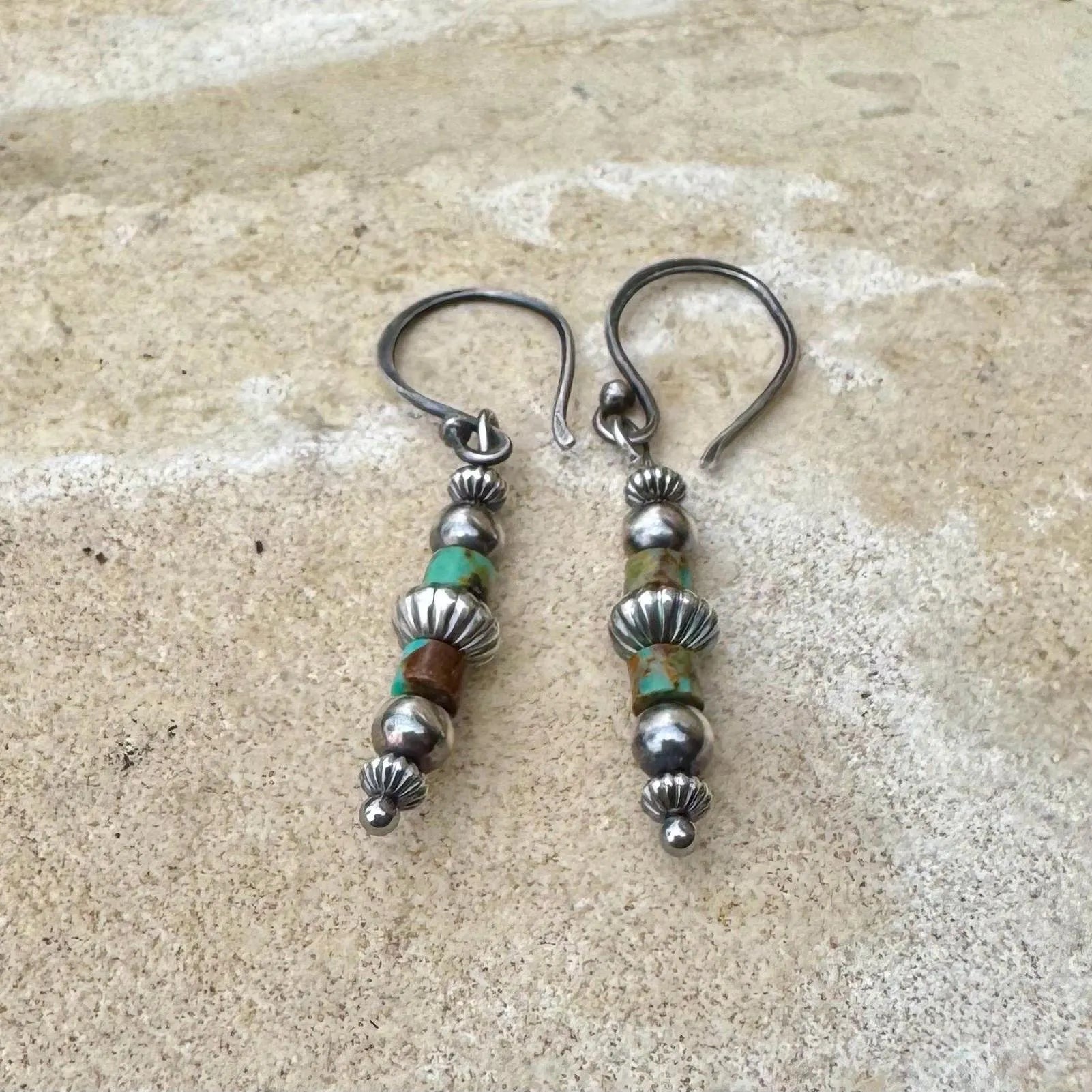 A little shimmer, a whole lot of soul. These handcrafted dangle earrings feature oxidized 3–5mm Navajo round and saucer pearls paired with 4mm American-sourced turquoise heishi beads in vibrant blue, green, and brown. They swing from hand-forged 20g Argentium silver ear wires — a purer, brighter silver alloy that resists tarnish and shines like a dream. With about 2-inch drop, they’re lightweight, full of movement, and rich in Southwest charm.