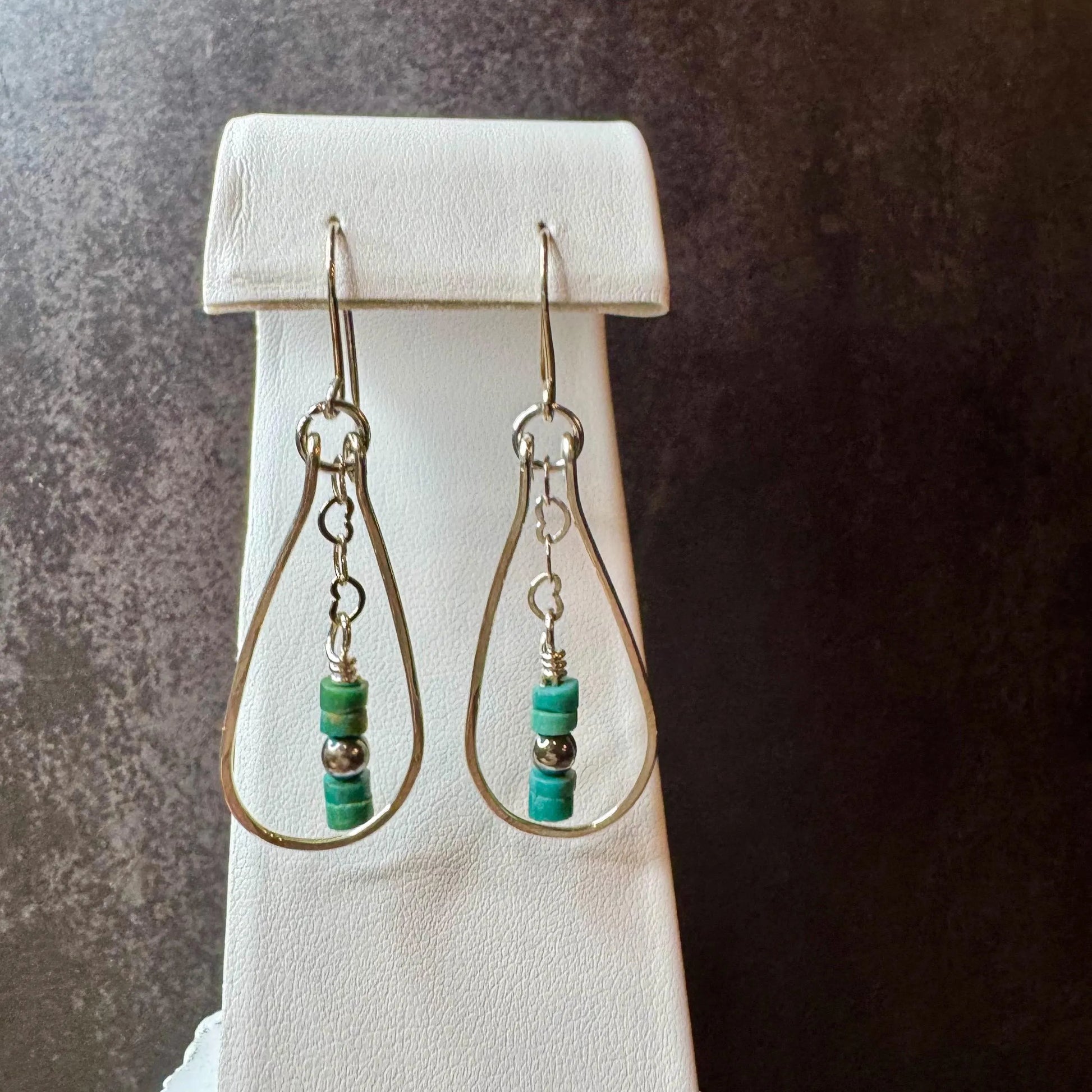 Teardrop sterling silver hammered drop earrings with 4mm genuine Blue Green Brown Turquoise and 4mm Navajo pearl dangling from 3mm delicate heart chain. Teardrops are made from 18g sterling silver and ear wires are 20g, both hand forged and solid, with about 2 inch drop including ear wires. These earrings have just the right amount of movement and length.