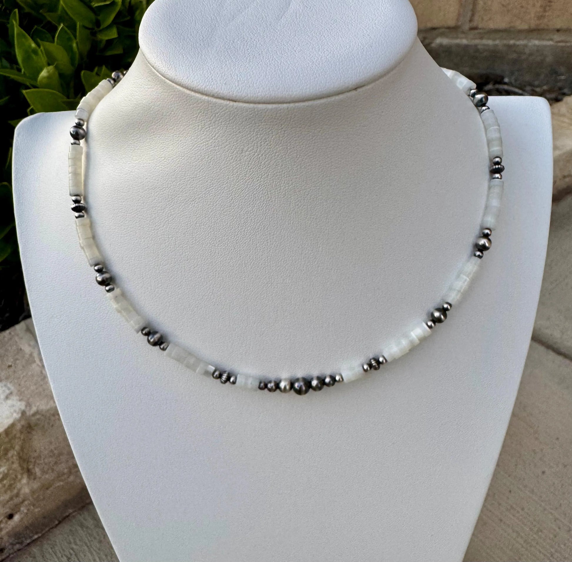 Explore the beauty of this Navajo Pearl and Mother of Pearl necklace, a stunning gemstone beaded piece that exudes Southwestern charm. Handcrafted with authentic Native artistry, this Sterling Silver choker is a perfect gift for her.