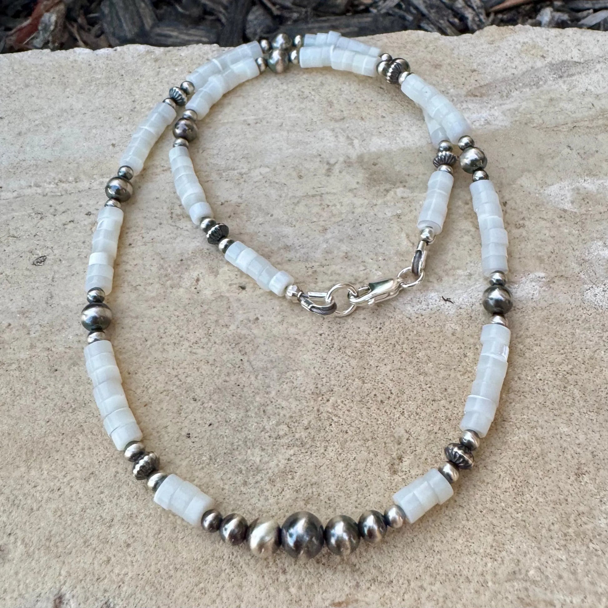Genuine Navajo pearls, 3-6mm bar center, 3-4mm accent round pearls, 4.5mm corrugated saucers, with 4mm natural Mother of Pearl heishi beads. Sterling silver end with lobster clasp. The length can be customized upon request/ special order.
