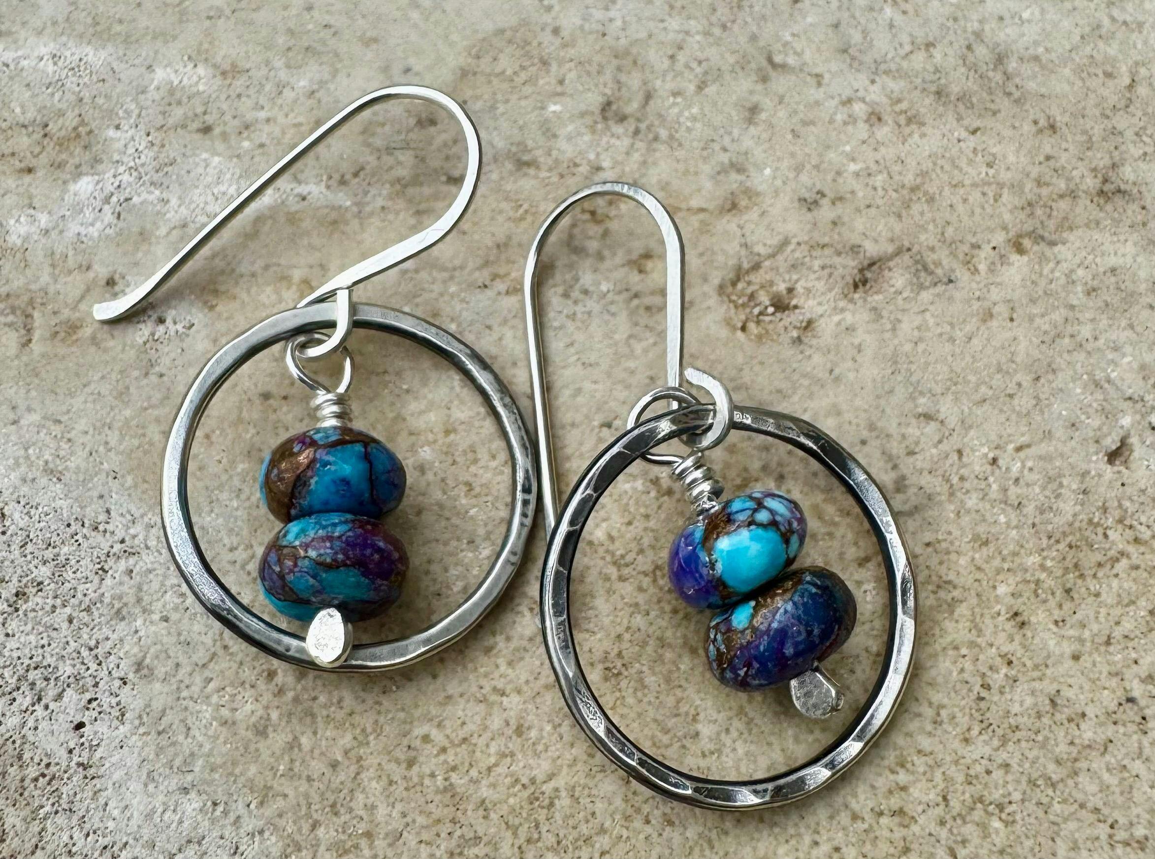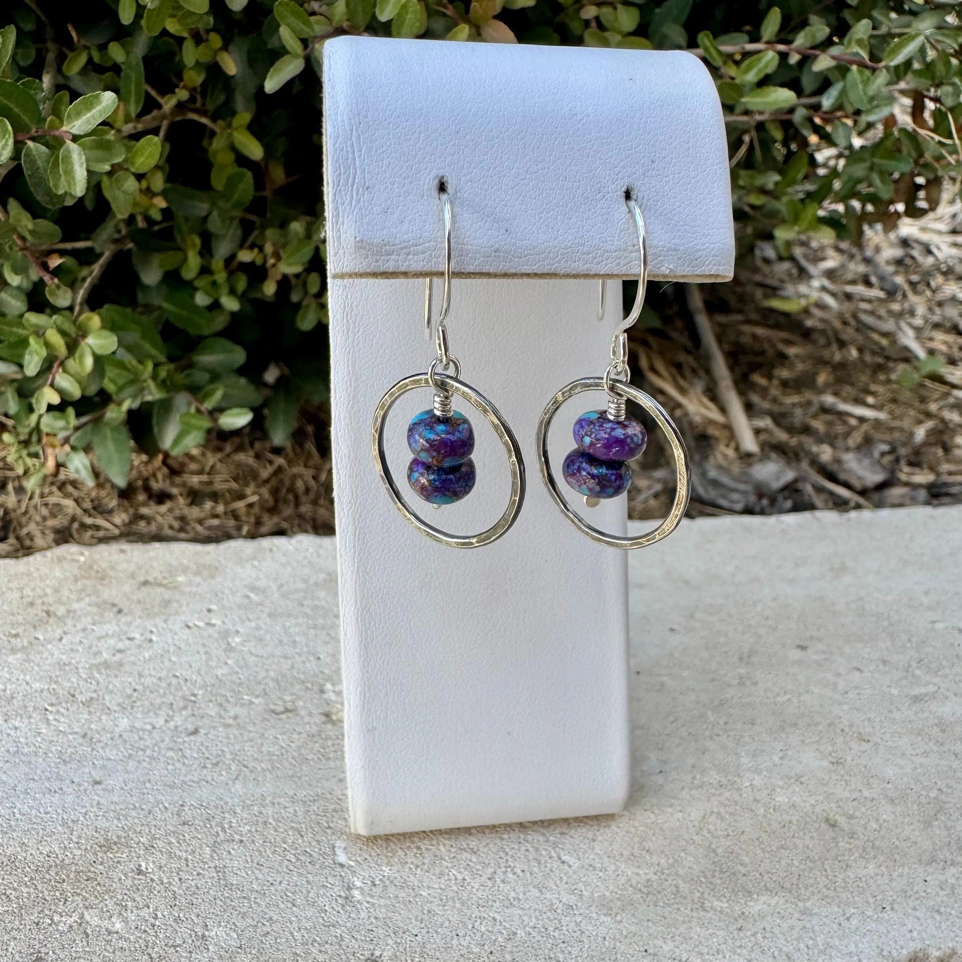 Bold and vibrant, these handcrafted earrings feature 7–8mm rondelle-cut Spotted Mohave Purple Kingman Turquoise gemstones, wrapped in sterling silver ball dot headpins. Suspended from oxidized, hammered 15mm sterling silver circles and finished with 20g hand-forged ear wires, each pair offers a rich blend of color, texture, and artisan detail.