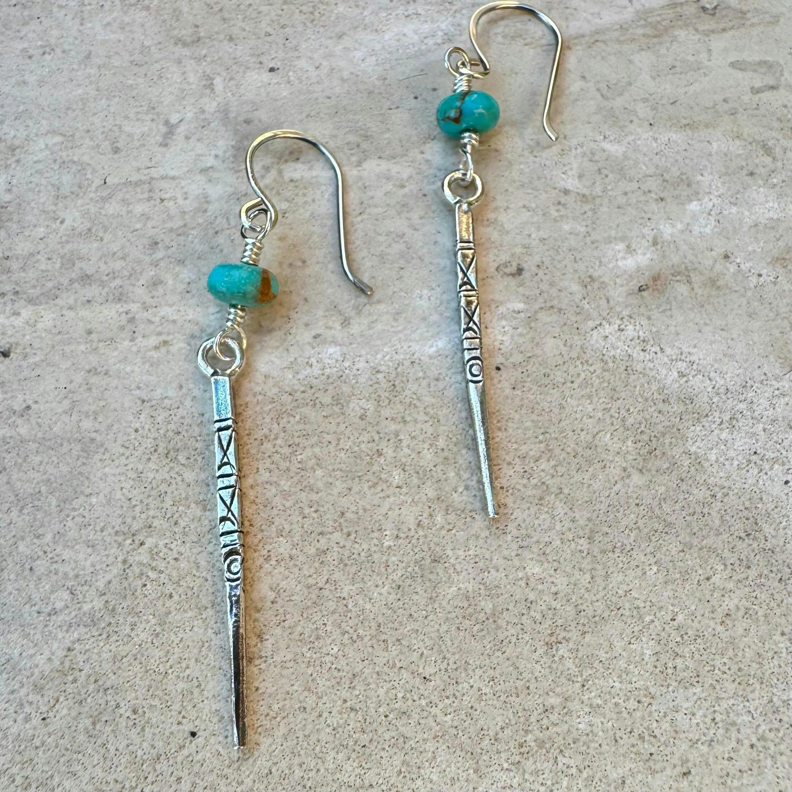 Sterling Silver Hill Tribe medium spike drops paired with 6mm rondelle Kingman turquoise beads in shades of blue, green, and brown. Finished with hand-forged 20g sterling silver ear wires. The spikes measure 32mm long, with a total drop of about 2.25 inches.