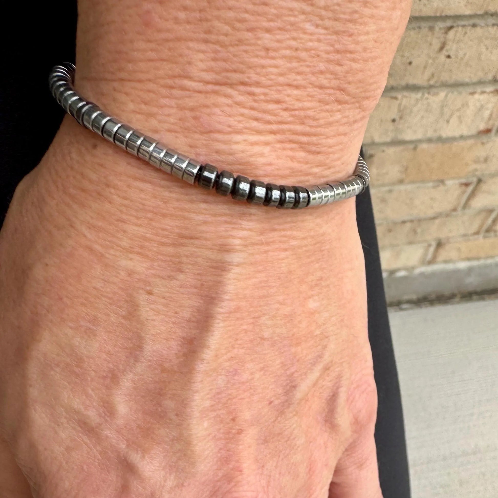 Absolutely stunning and grounded in strength, this unisex bracelet features a mix of natural hematite beads in smooth rondelle, thin disc, and silver-black heishi forms — all AAA grade, untreated, and cool to the touch. Accented with solid sterling silver spacers, swivel lobster clasp, and end rings, this bracelet complements any beaded or cuff stack or makes a bold statement on its own.