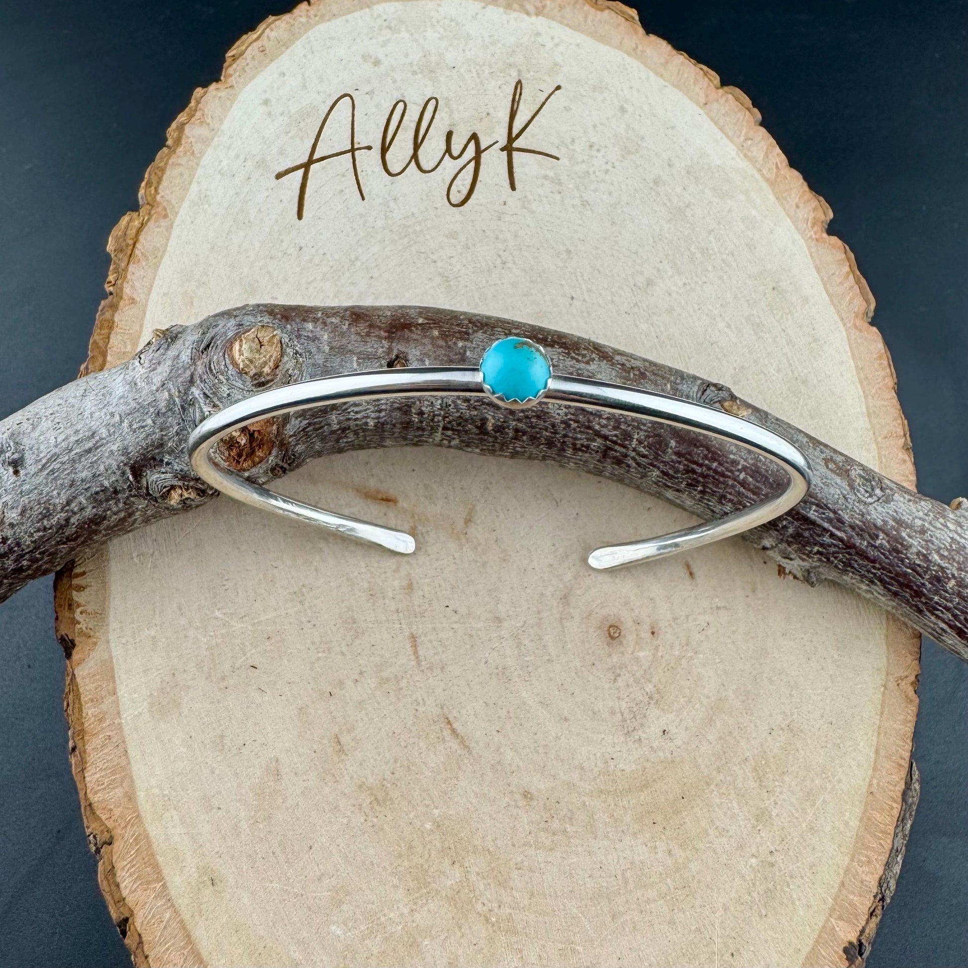 Graceful and grounding, this handcrafted cuff bracelet is made from 10-gauge sterling silver wire, shaped by hand and set with a 6mm Kingman Turquoise gemstone in a serrated bezel. Its minimalist design highlights the vibrant turquoise while offering a sleek, versatile silhouette — perfect for stacking or wearing solo.