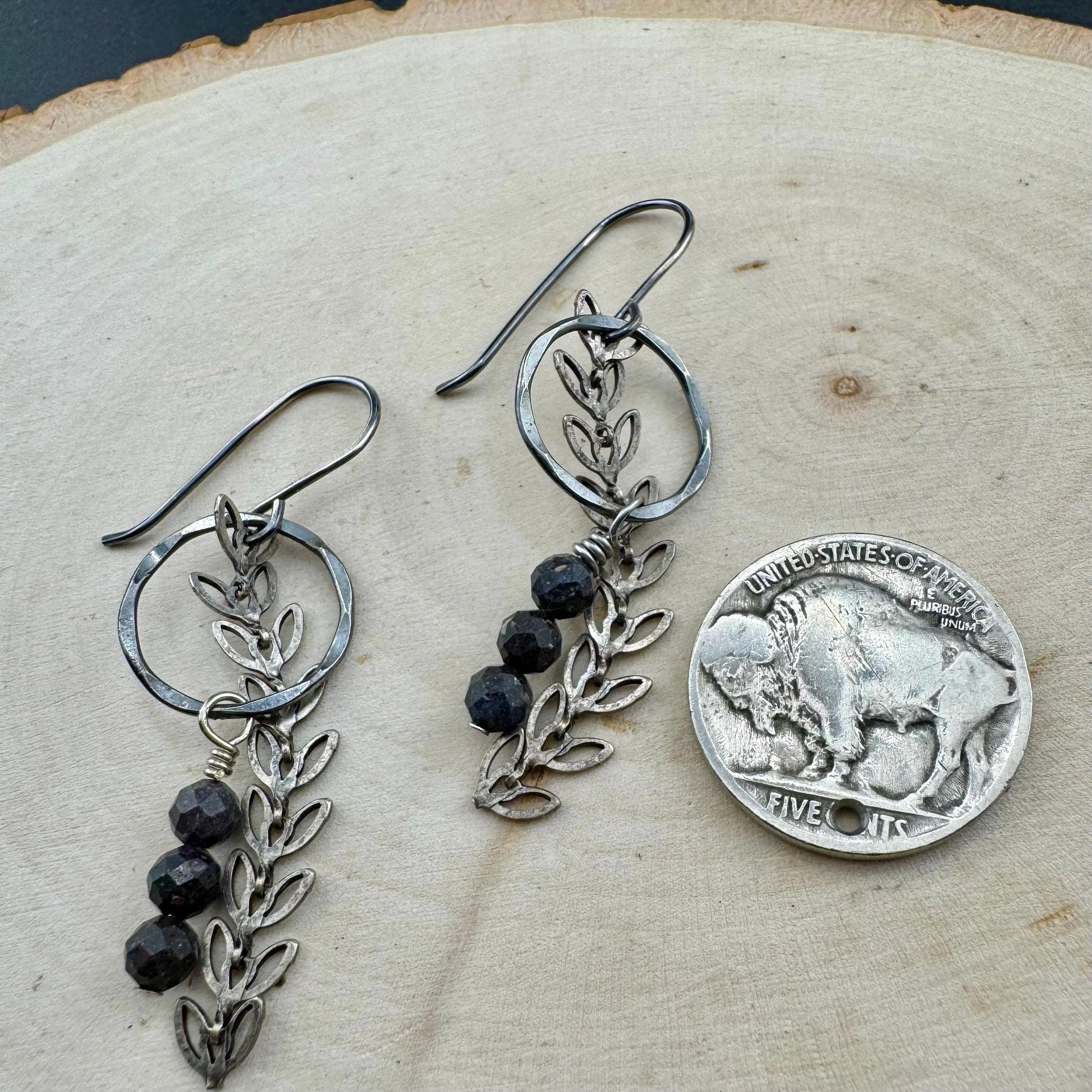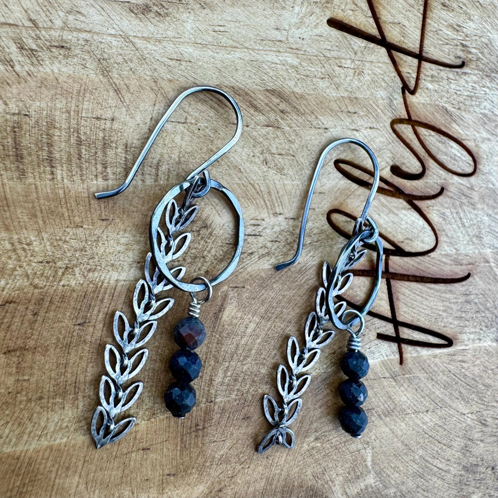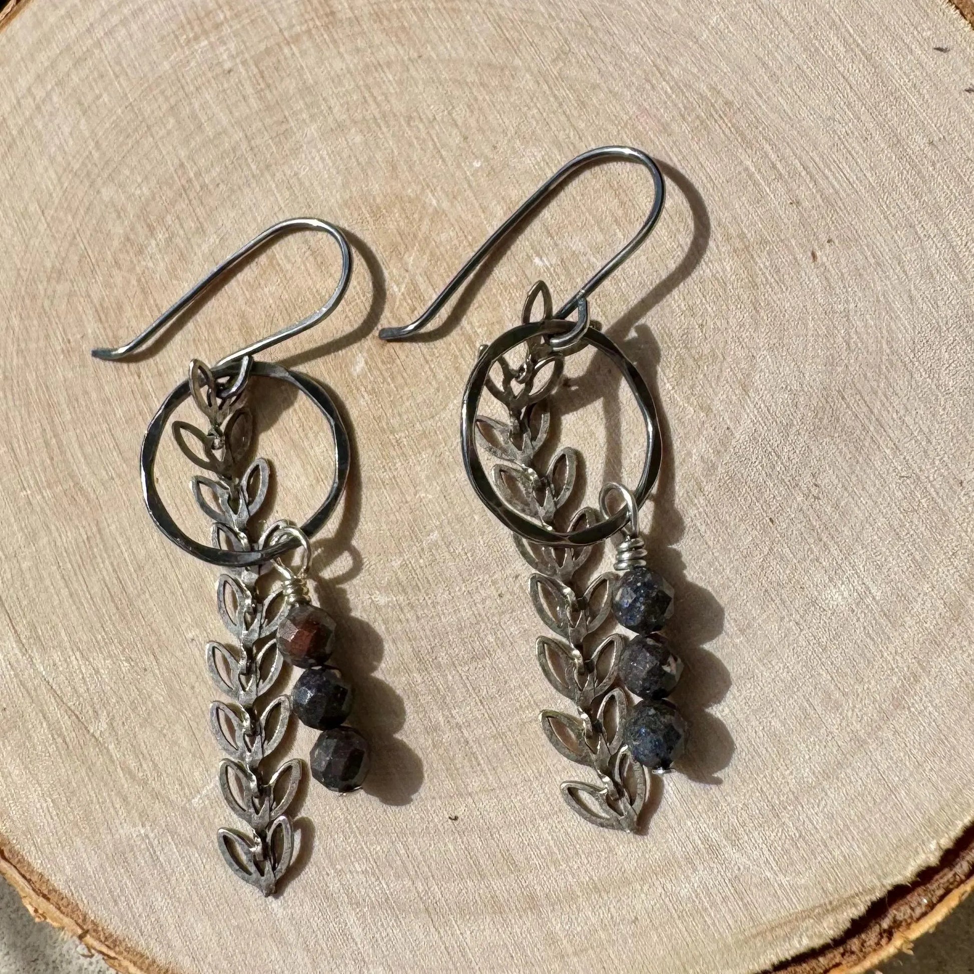 Australian black opal round gemstones with sterling silver oxidized circle and chevron antique silver chain. Ear wires are 20g hand forged and oxidized. Ear wires are 20g hand forged and oxidized. Chain is plated, all other components are sterling silver and hand forged by me. Dangle is a little over 2 inches total.
