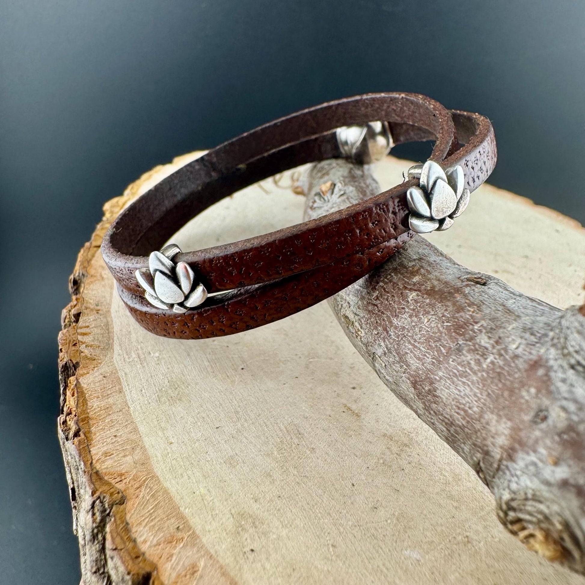 Earthy elegance meets mindful design in this handcrafted wrap bracelet made from genuine 5mm camel-colored flat leather. Adorned with silver zamak lotus flower spacers and finished with a sleek magnetic clasp, this piece offers a harmonious blend of natural texture and symbolic charm.