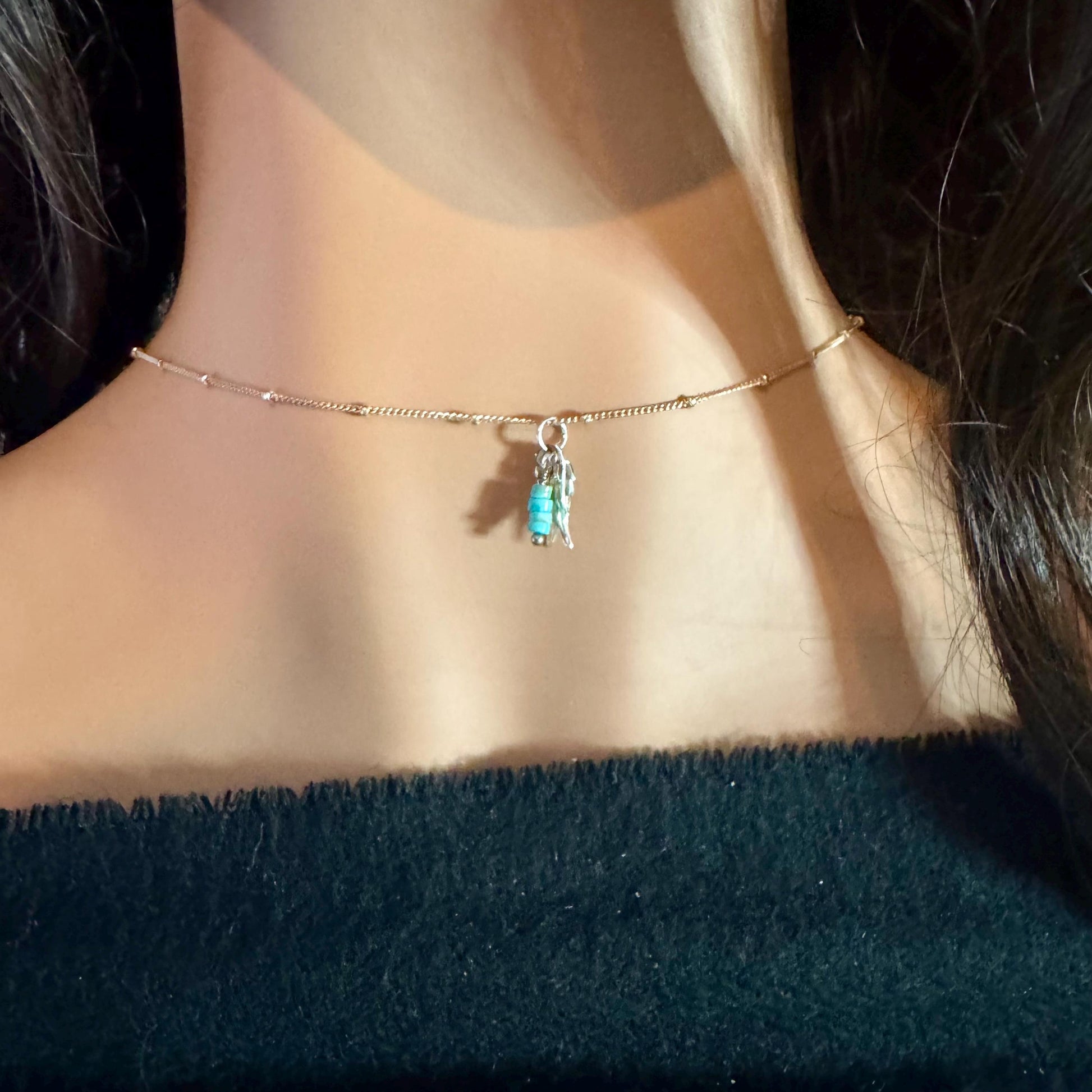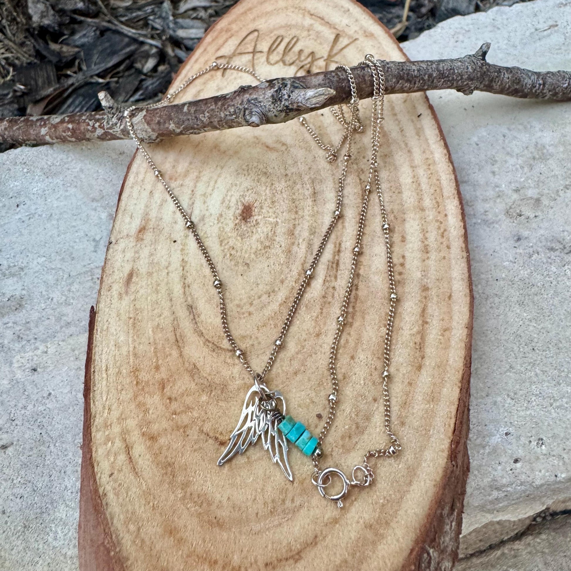 Sterling Silver Angel Wing Necklace - This necklace is a whisper of protection and a wink of desert soul. Featuring two 13mm sterling silver angel wing charms paired with a 4mm rustic Kingman turquoise dangle, it’s strung on a 1.5mm delicate sterling silver satellite chain — genuine 925 silver, no plating, just shine and strength.
