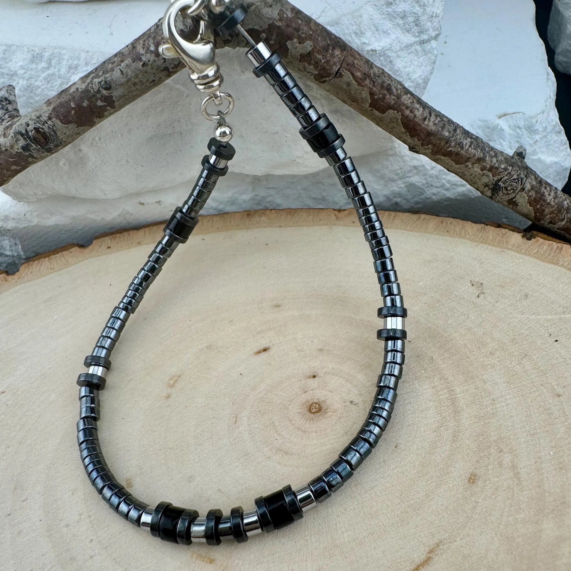Gemstones: Natural Hematite (3–4mm silver and black beads), Black Onyx (4mm heishi beads)