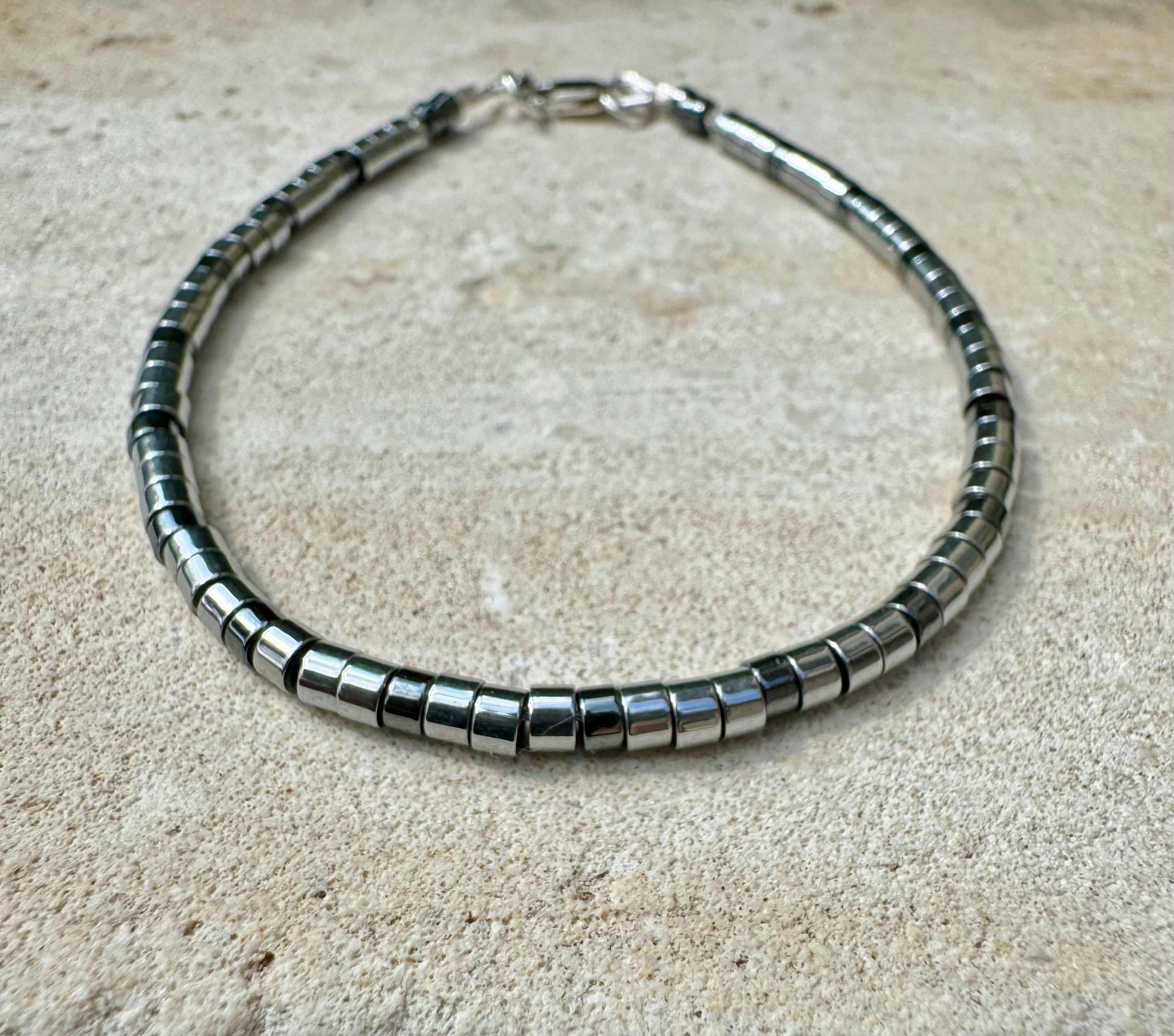 This sleek and versatile bracelet features natural hematite beads in black and silver tones, accented with solid sterling silver spacers, end rings, and a secure lobster clasp. The minimalist design pairs effortlessly with any beaded or cuff bracelet stack, or makes a subtle statement all on its own.
