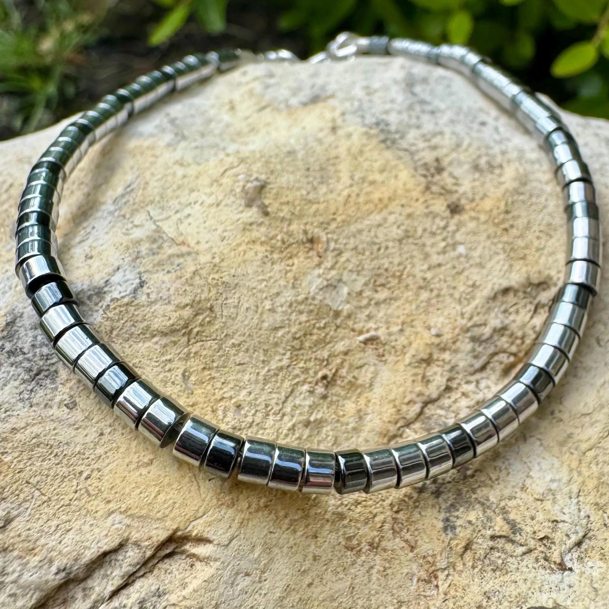 Crafted with 3mm heishi-cut hematite, this bracelet offers a smooth, cool-to-the-touch feel and a polished metallic sheen. All components are solid sterling silver — no plating.