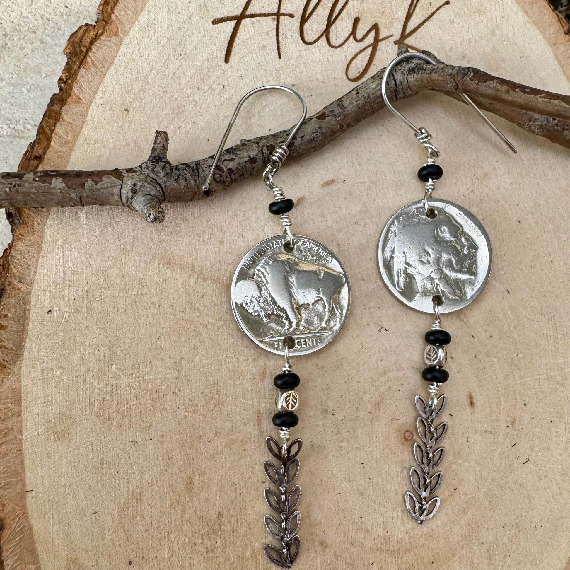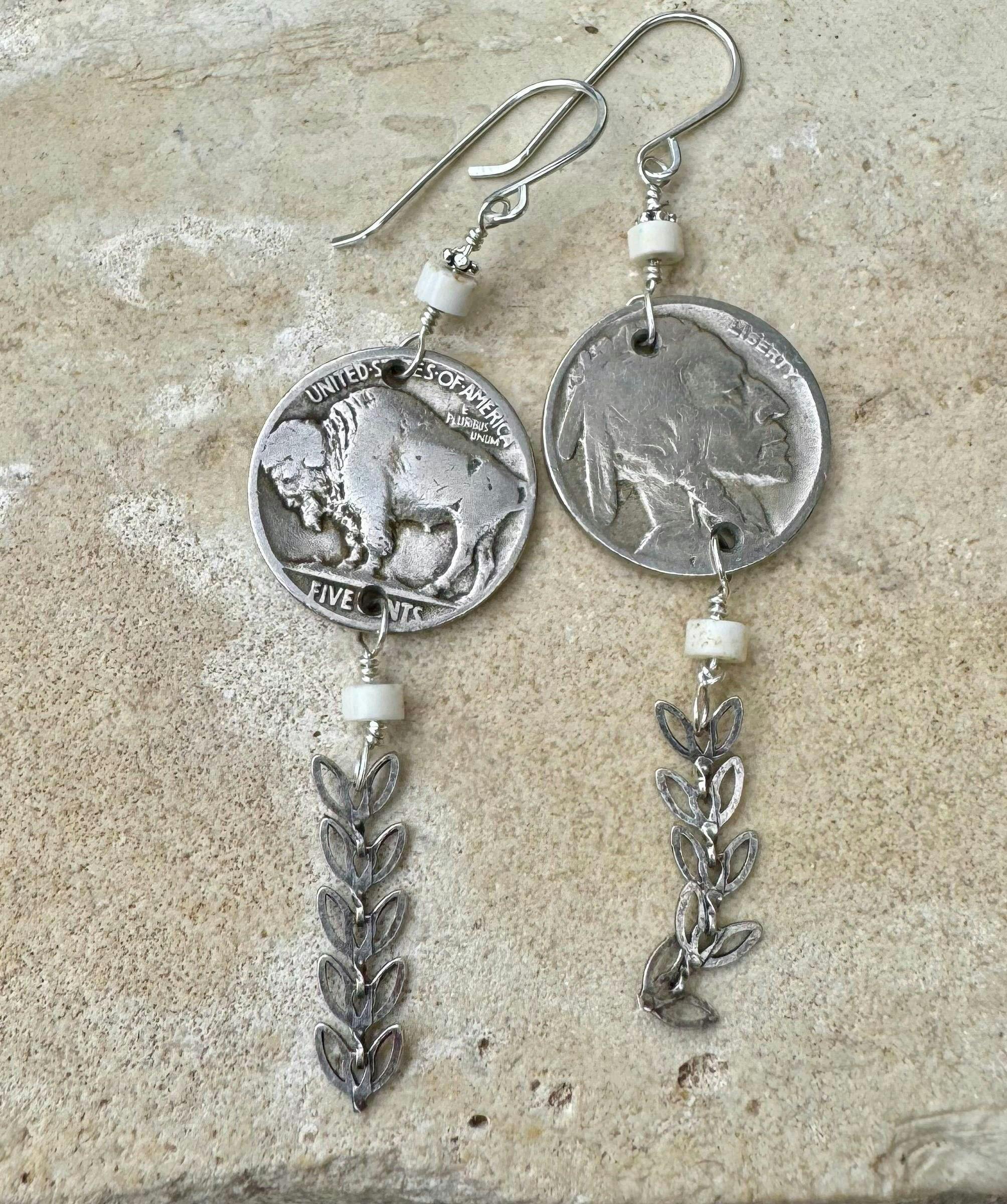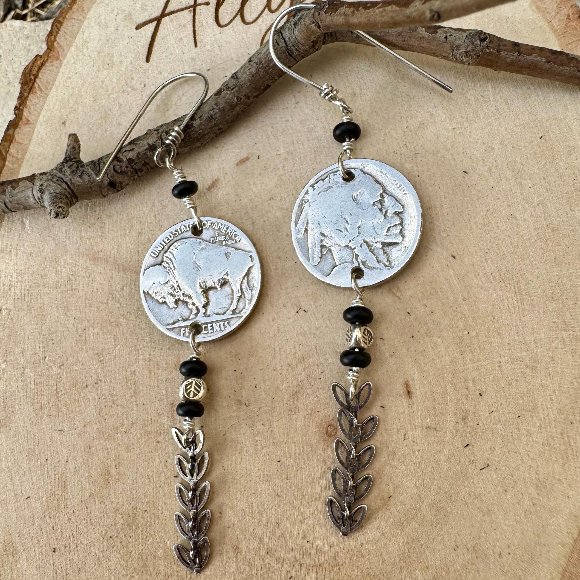 Authentic Indian Head Buffalo Nickels (1913–1938) meet natural 4mm black onyx rondelles and sterling silver feather spacers in this rustic, soulful pair. Finished with hand‑forged 20g sterling silver ear wires, they measure about 3.25 inches long with plenty of swing and story.