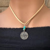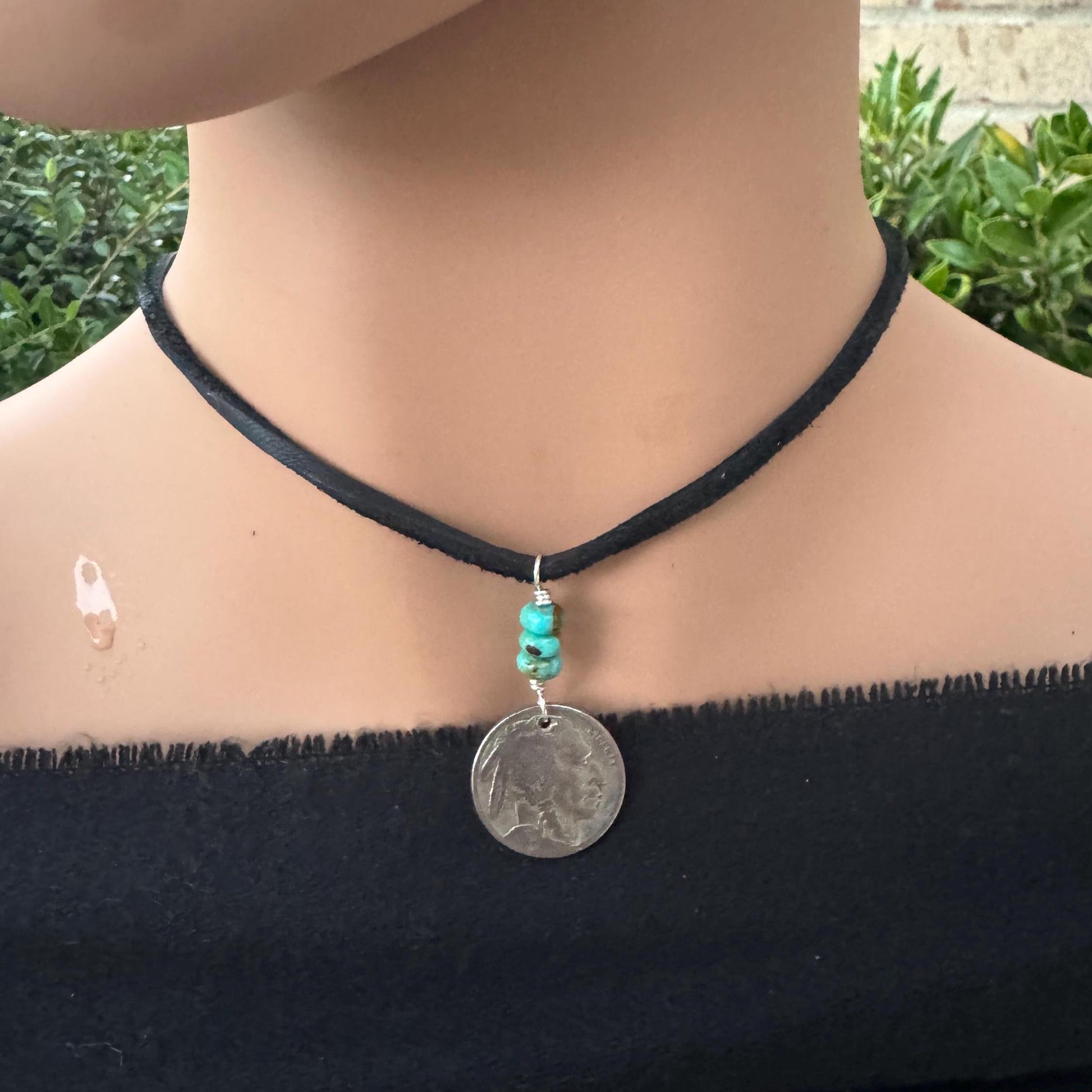 A tribute to heritage and healing, this handcrafted necklace features an authentic Indian Head Buffalo Nickel paired with 6mm rondelle-cut Kingman Turquoise beads in rich blue-green hues. Strung on ultra-soft genuine deerskin lace and finished with sterling silver wiring and a lobster clasp, this piece offers adjustable wear from 16 to 22 inches — perfect as a choker or layered statement.