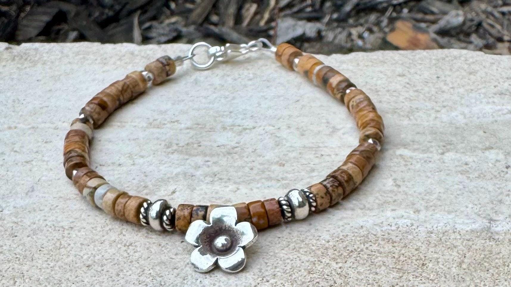 Celebrate the beauty of the everyday with this handcrafted Picture Jasper bracelet, featuring 4mm natural heishi beads, sterling silver accent spacers, and a charming 10mm sterling silver flower charm. Finished with sterling silver end rings and a lobster clasp, this bracelet is perfect for stacking with cuffs or other beaded favorites.