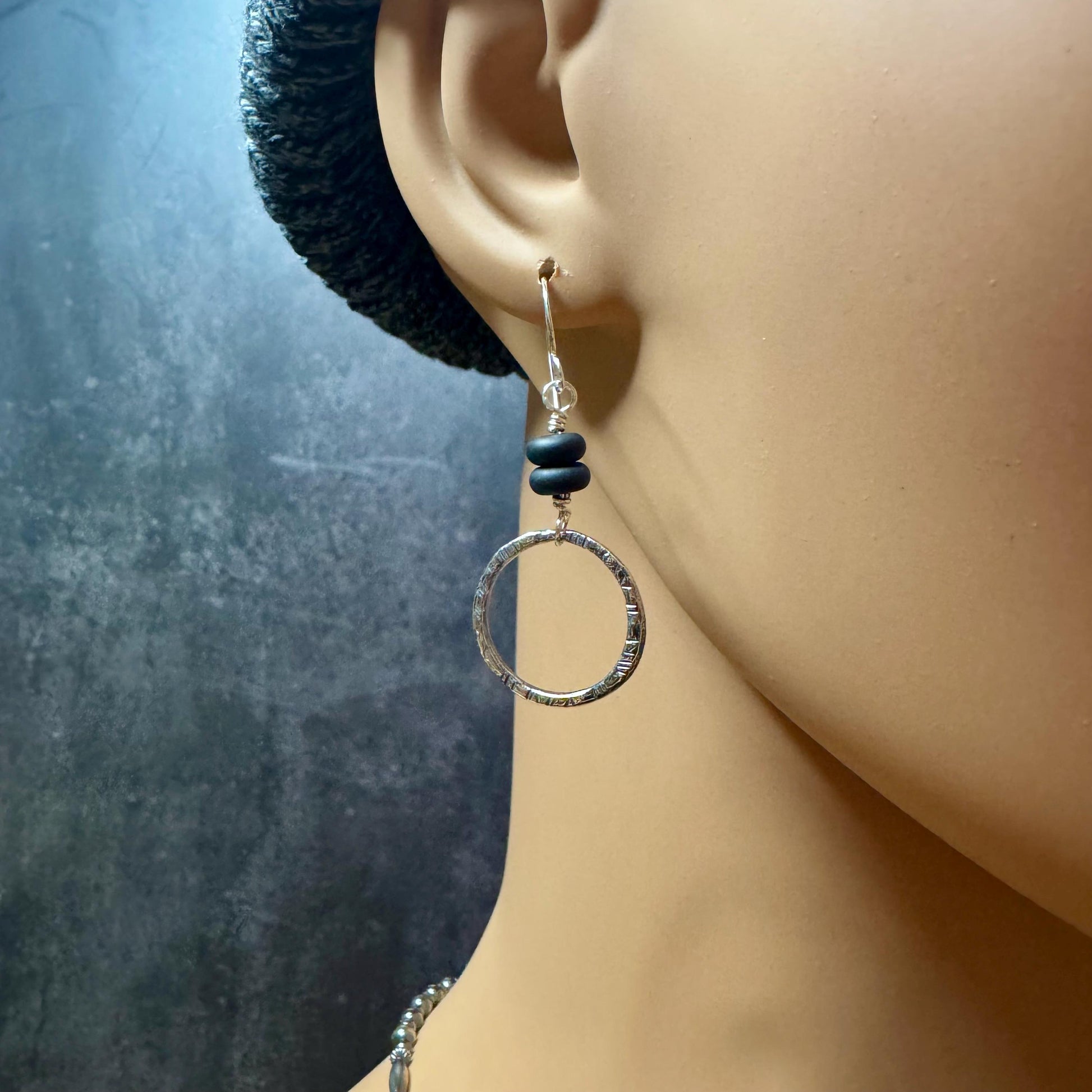Handcrafted with a whole lotta care and just enough attitude, these earrings feature .75 inch (19mm) sterling silver circles forged from 16g wire — hammered, oxidized, and textured for that lived‑in, kicked‑up‑dust kinda look. A single 6mm Black Onyx rondelle brings a touch of mystery, while 20g sterling silver ear wires keep the fit lightweight and easy for everyday wear.