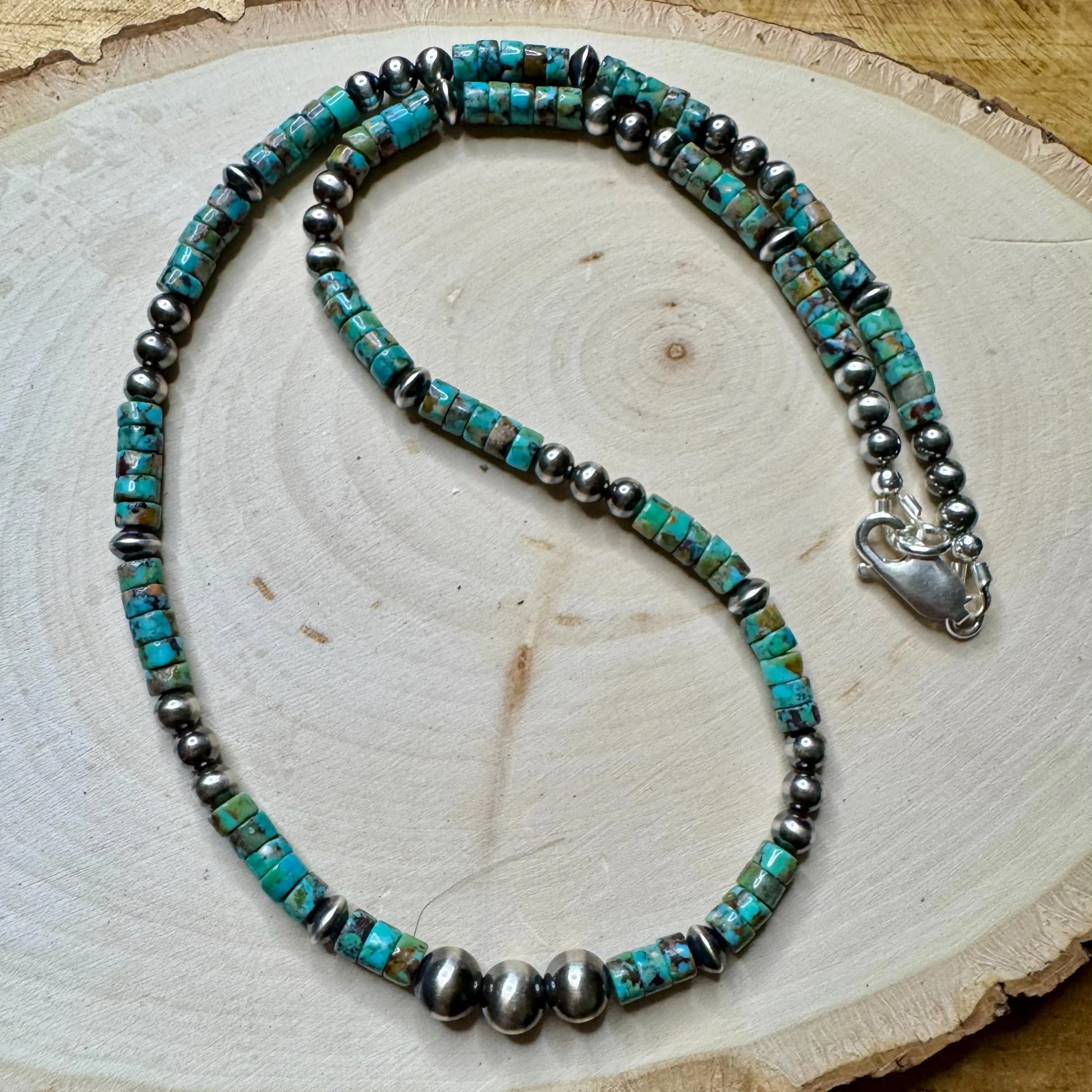 Genuine 100% natural AAA Genuine Natural Blue Green Brown Turquoise 4mm Smooth Heishi Beads with absolutely no dye/color treatment. Authentic Navajo Pearls- 6mm center & 4mm round pearls, 4.5mm saucers. Sterling silver end with lobster clasp. This is my personal favorite turquoise color/ variety. The length can be customized upon request/ special order.