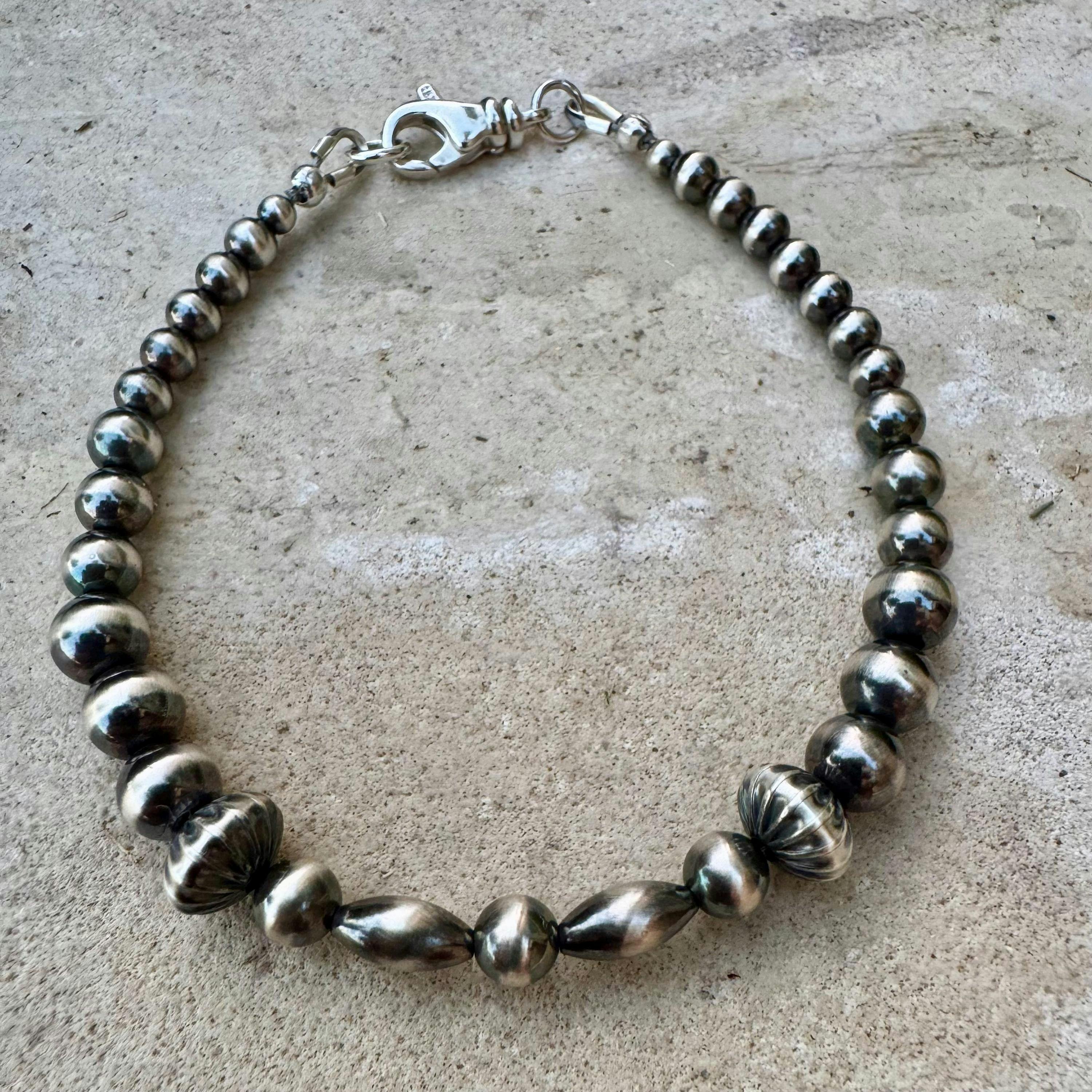 Sterling Silver Navajo Pearl Bracelet – Oxidized Finish | 3–6mm Rounds, Corrugated & Torpedo Beads