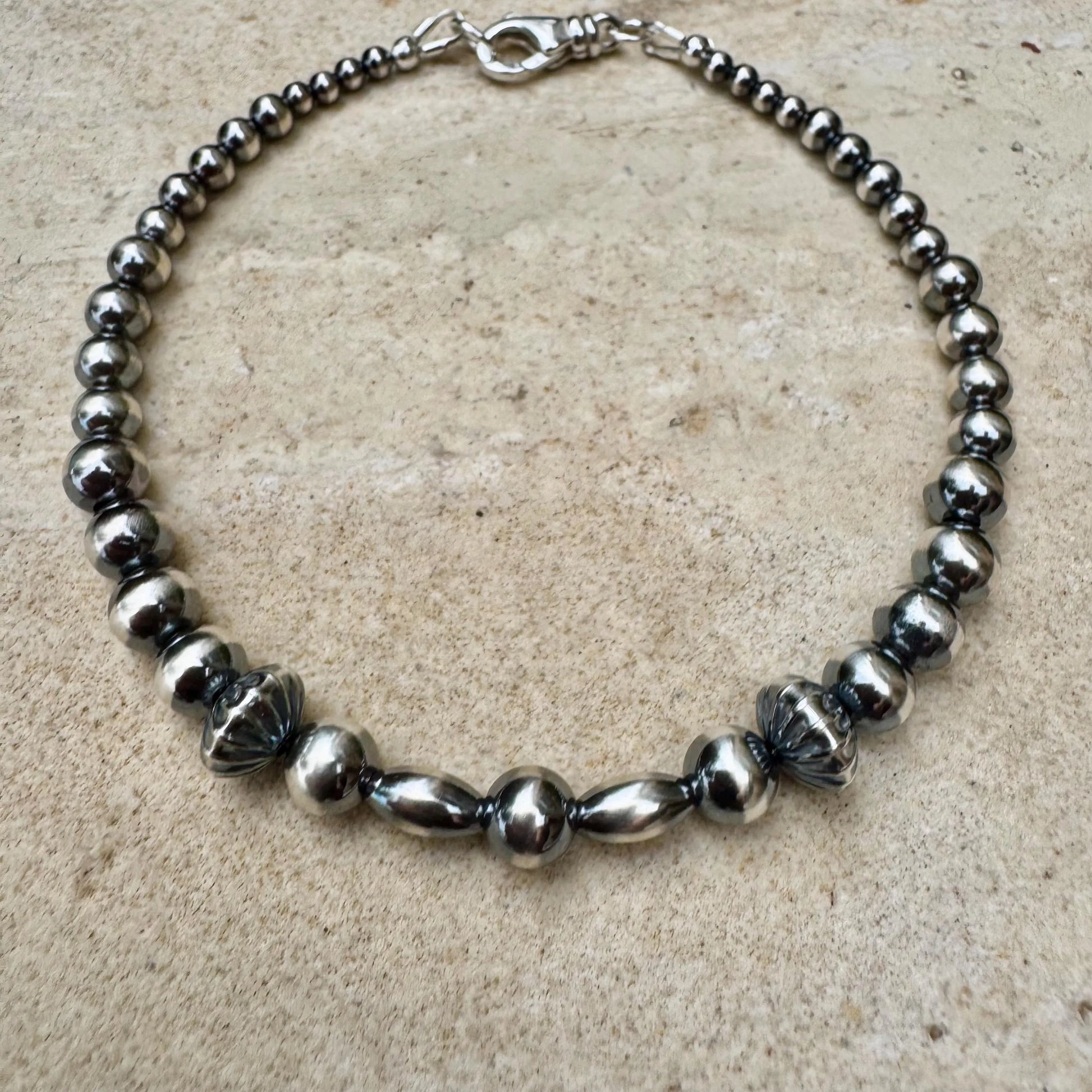 Pearls: Genuine sterling silver Navajo pearls – 3–6mm round, 8mm corrugated, 4mm torpedo
