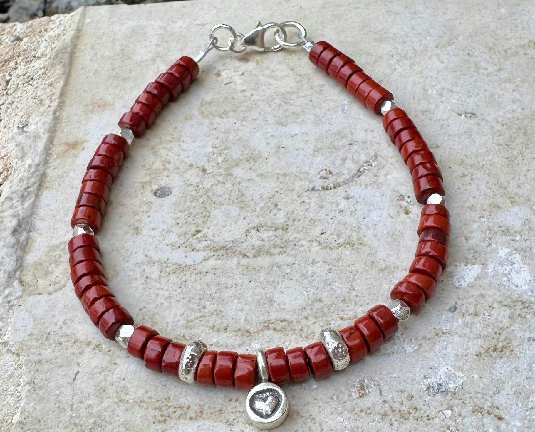 Grounded in elegance and passion, this handcrafted bracelet features 4mm natural Red Jasper heishi beads, accented with sterling silver spacers and a dainty 5mm heart charm. Made entirely from solid sterling silver (no plating), including end rings and a secure lobster clasp, this piece adds warmth and depth to any bracelet stack or stands beautifully on its own.