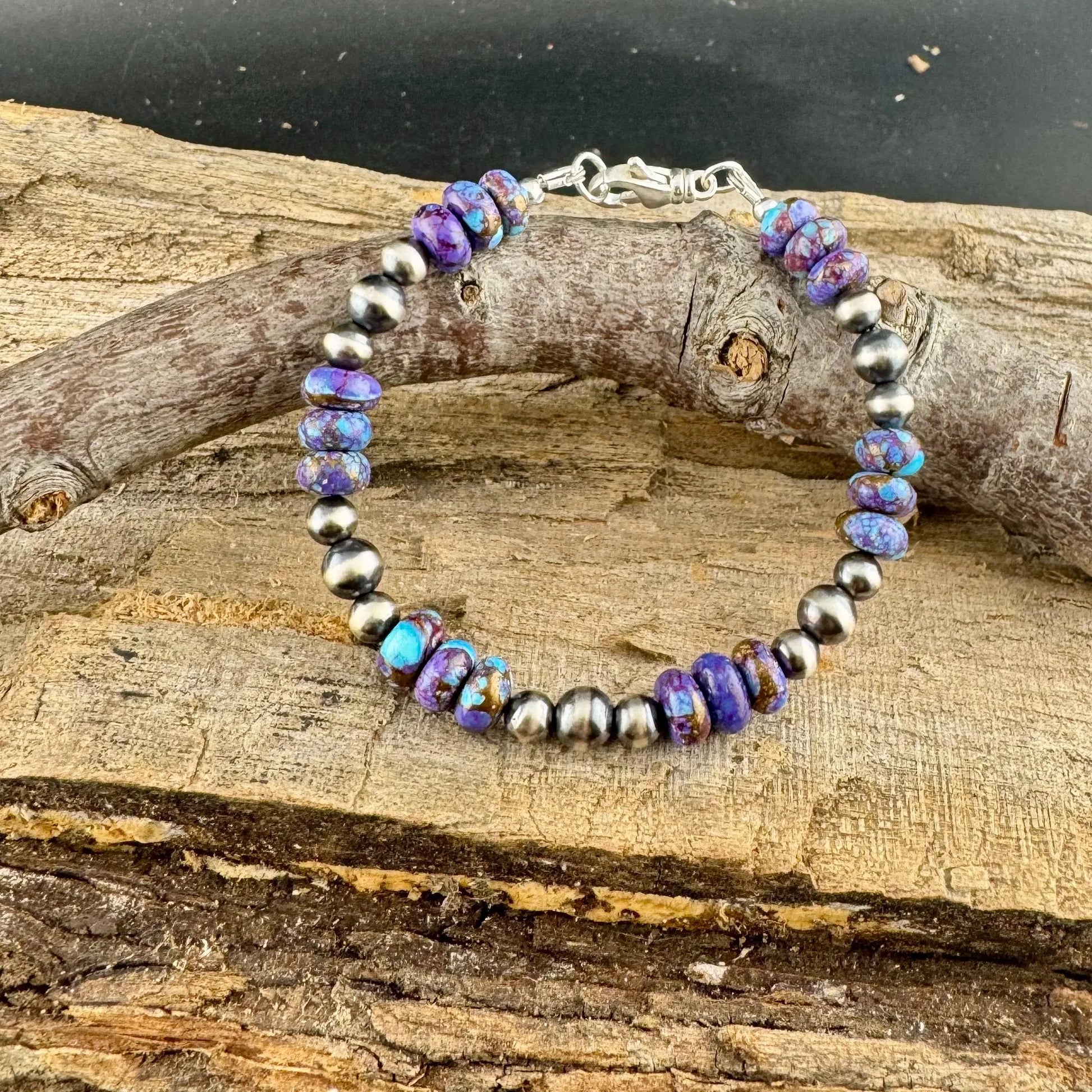 🪶 Features • Pearls: 5mm & 6mm sterling silver Navajo pearls • Gemstones: 6–7mm purple Mohave turquoise rondelles (color‑treated) • Hardware: Sterling silver end rings + swivel lobster clasp • Style: Southwestern, boho, artisan‑crafted • Finish: Oxidized silver with bold purple contrast