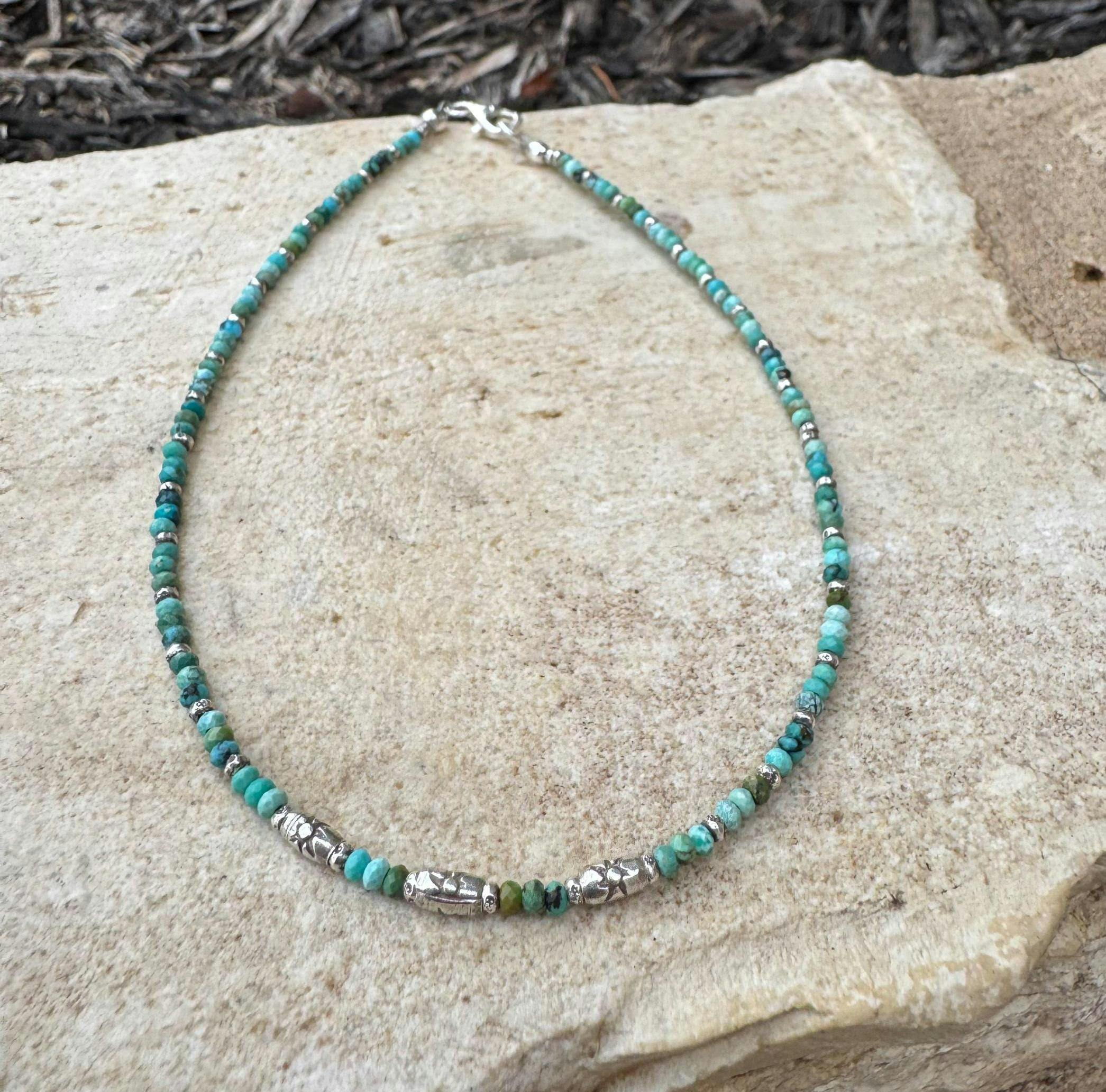This ultra-lightweight ankle bracelet features genuine 2mm micro-cut faceted turquoise rondelles, accented with sterling silver spacer beads and finished with a sterling silver lobster clasp. Delicate, minimalist, and full of quiet charm — perfect for stacking or wearing solo.